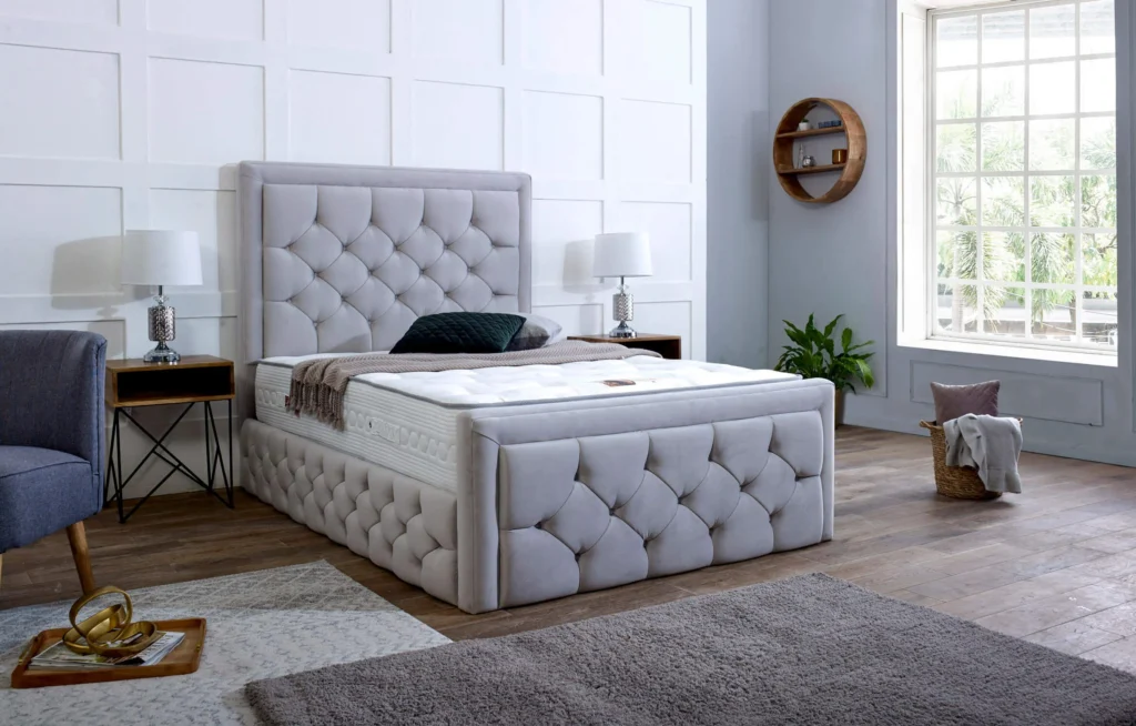 The set features a hand-crafted, pleated 36″ tall Chesterfield headboard, available with either matching fabric buttons or sparkling diamante buttons. The headboard is complemented by a hand-crafted and pleated footboard, providing a cohesive and stylish look. Note that if you opt for 2 drawers on the side, please specify which side you prefer them to open from.